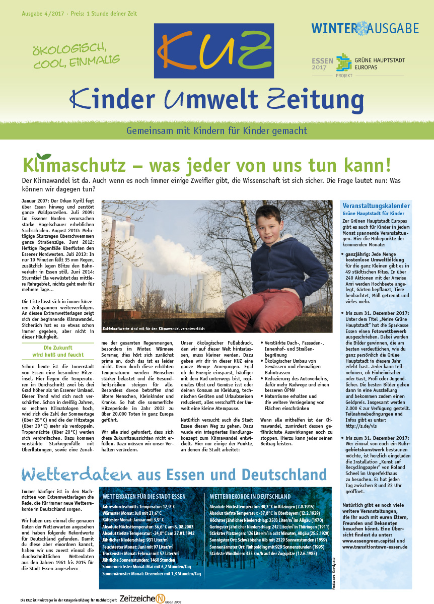 Godau, Michael / Cub, Nicole / Lukaszuk, Edyta Joanna / Nesselhauf, Georg / Sensen, Birgit (2017): KinderUmweltZeitung. Ausgabe 4/2017. Hrsg.: Mobilität-Werk-Stadt für die Metropole Ruhr.