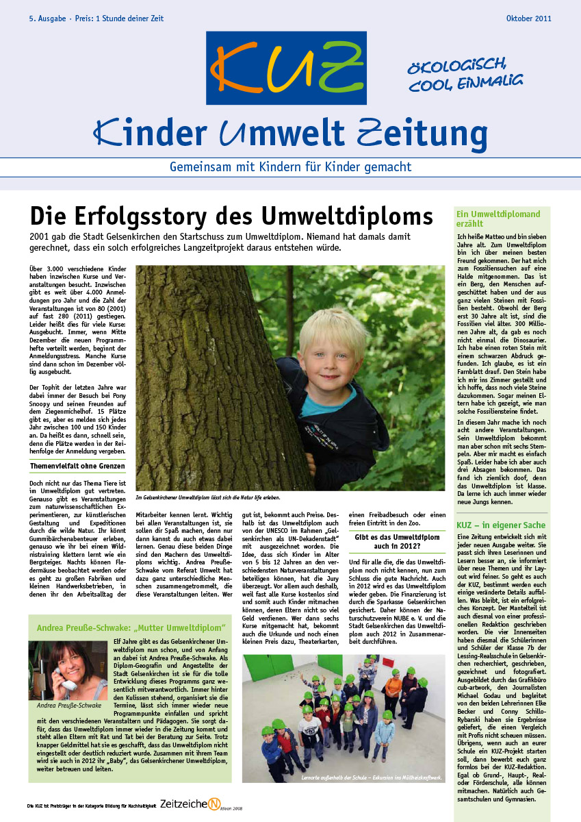Godau, Michael / Cub, Nicole / Rybarski, Werner / Sensen, Birgit / Wenzel, Thomas (2011): KinderUmweltZeitung. Ausgabe 5/2011. Hrsg.: Stadt Gelsenkirchen, Der Oberbürgermeister, Referat Umwelt und aGEnda 21.