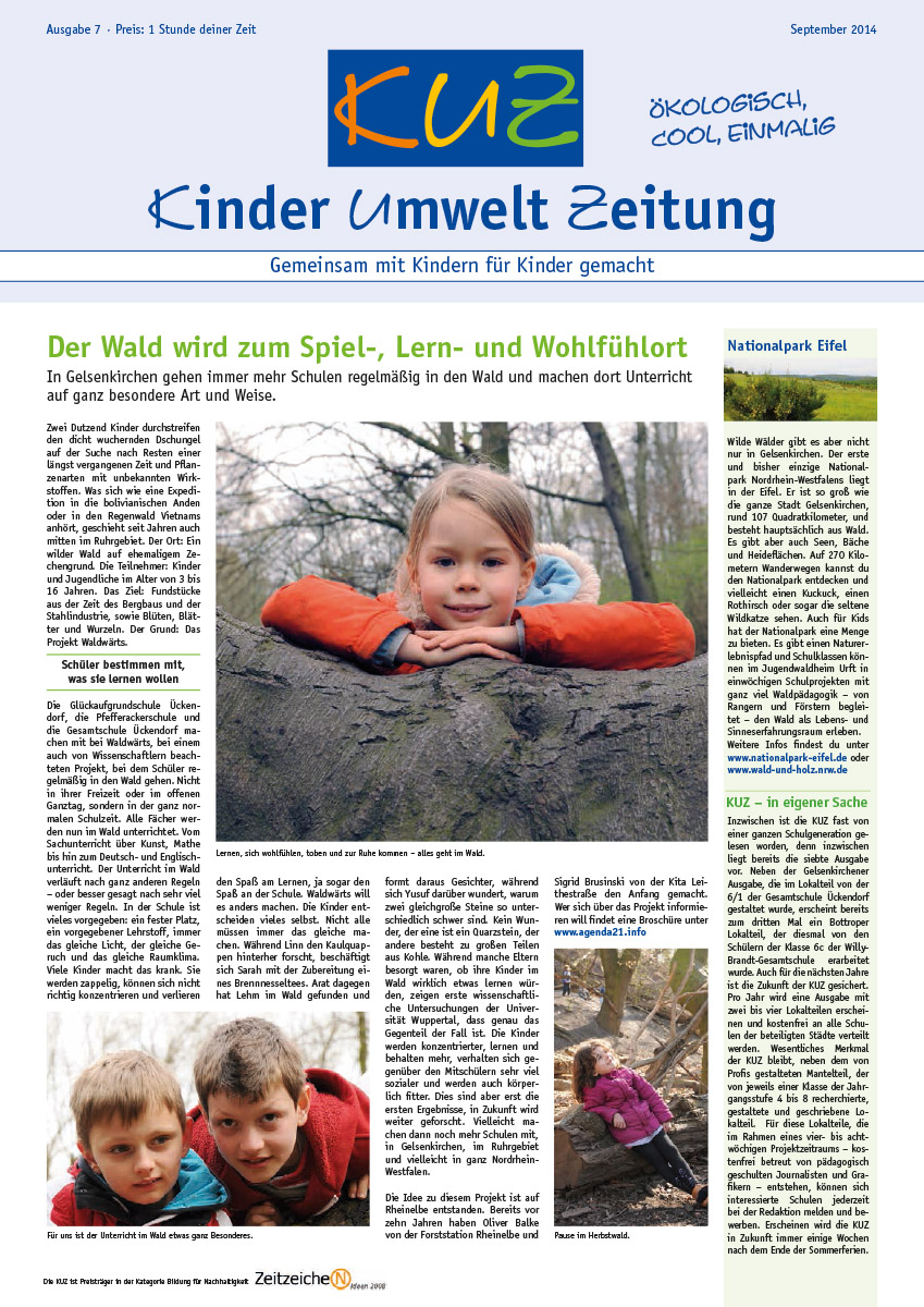 Godau, Michael / Cub, Nicole / Lukaszuk, Edyta Joanna / Nesselhauf, Georg / Preuße-Schwake, Andrea / Rybarski, Werner / Sensen, Birgit / Wenzel, Thomas (2014): KinderUmweltZeitung. Ausgabe 7/2014. Hrsg.: Stadt Gelsenkirchen, Der Oberbürgermeister, Referat Umwelt und aGEnda 21 in Zusammenarbeit mit den Umweltämtern der Städte Bottrop und Essen.