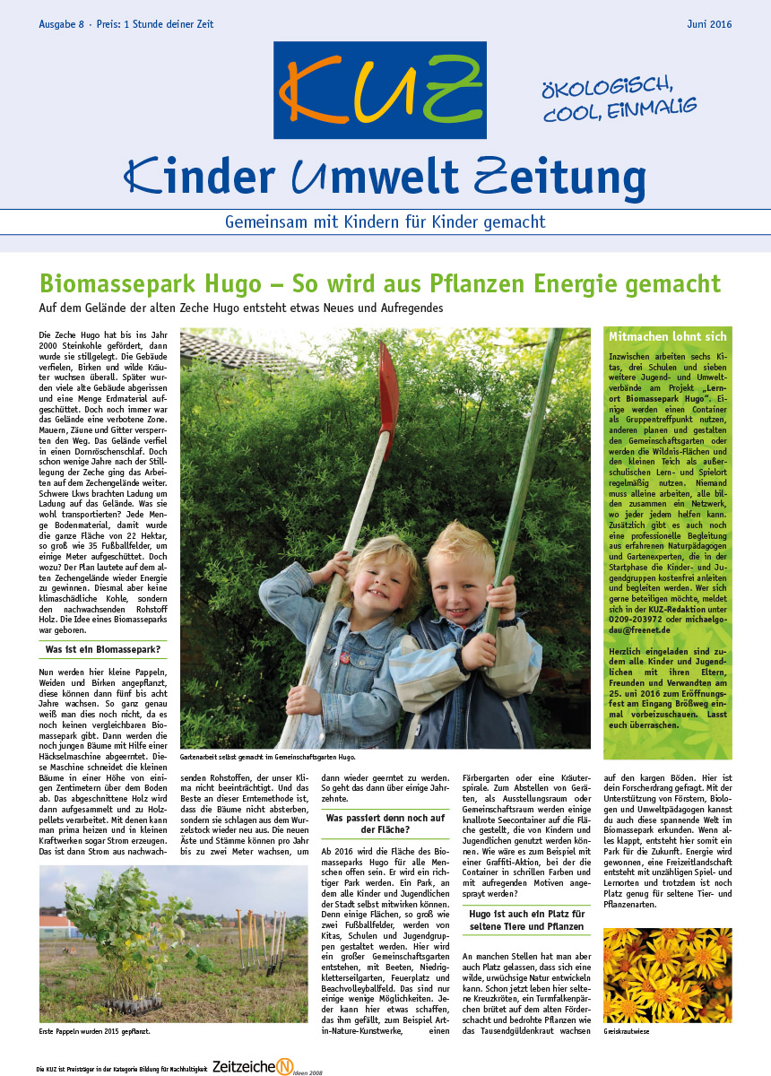 Godau, Michael / Cub, Nicole / Lukaszuk, Edyta Joanna / Rybarski, Werner / Sensen, Birgit / Wenzel, Thomas (2016): KinderUmweltZeitung. Ausgabe 8/2016. Hrsg.: Stadt Gelsenkirchen, Der Oberbürgermeister, Referat Umwelt und aGEnda 21.